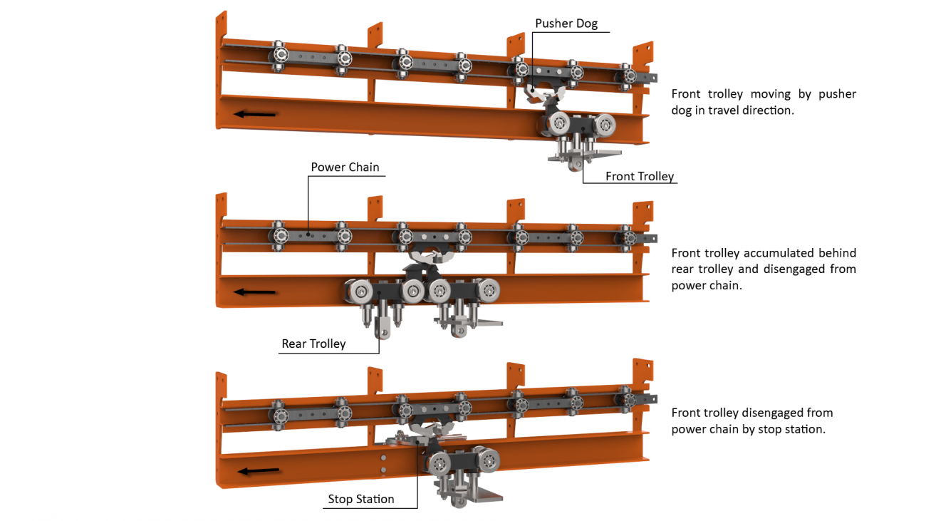 Les convoyeurs Power & Free T4 sont basés sur un système à deux voies. Le rail supérieur est utilisé pour la chaîne d'entrainement et le rail inférieur pour les chariots porteurs. À pas égal, des taquets sont montés sur la chaîne d'entrainement et sont utilisés pour déplacer les chariots porteurs dans le système. Les taquets s'enclenchent sur le chariot porteur pour connecter le chariot à la chaine d’entrainement.
