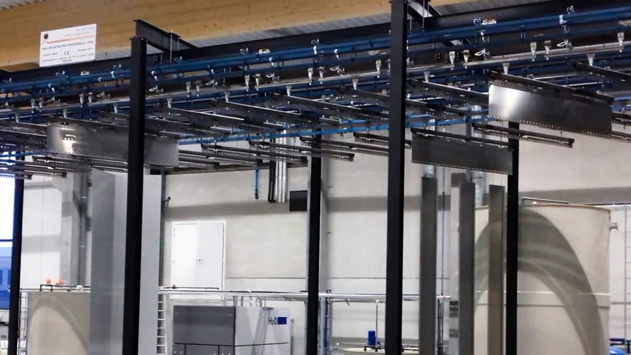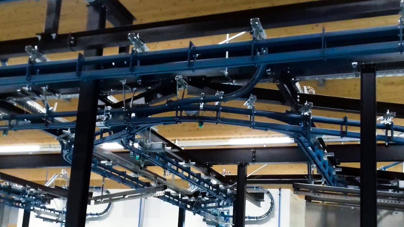 Nella "power rail" scorre una catena di trasporto rotante azionata da un motore. I cani di spinta sono avvitati nella catena del trasportatore ad intervalli regolari. Questi hanno due chiusure con le quali possono agganciarsi ai carrelli sottostanti e tirarli lungo il binario. I carrelli scorrono nella "rotaia libera" e assorbono il peso del carico del rimorchio.