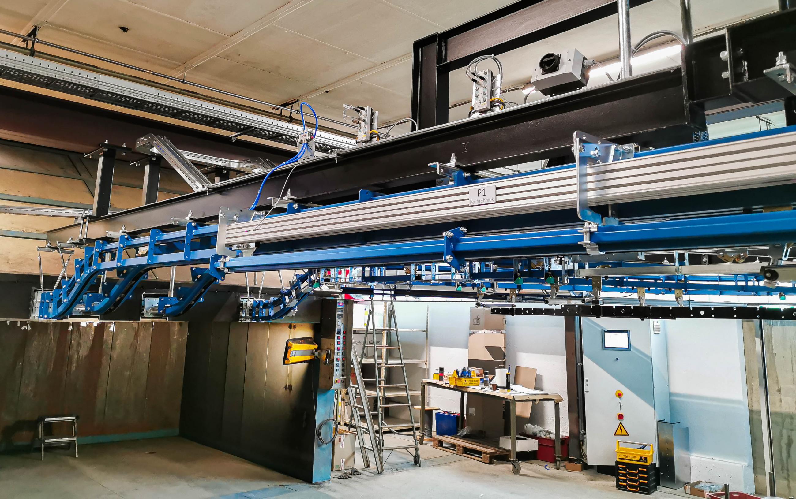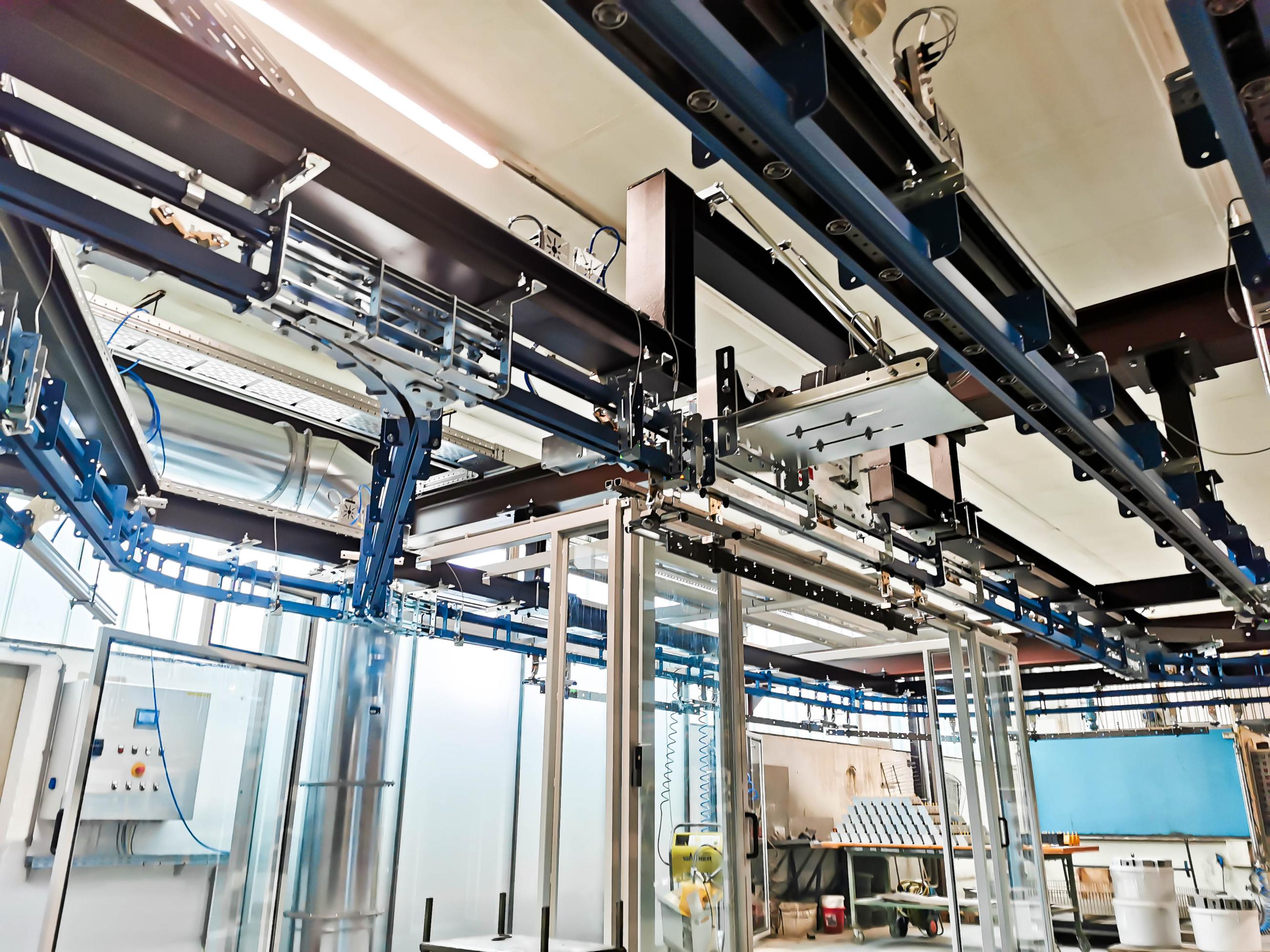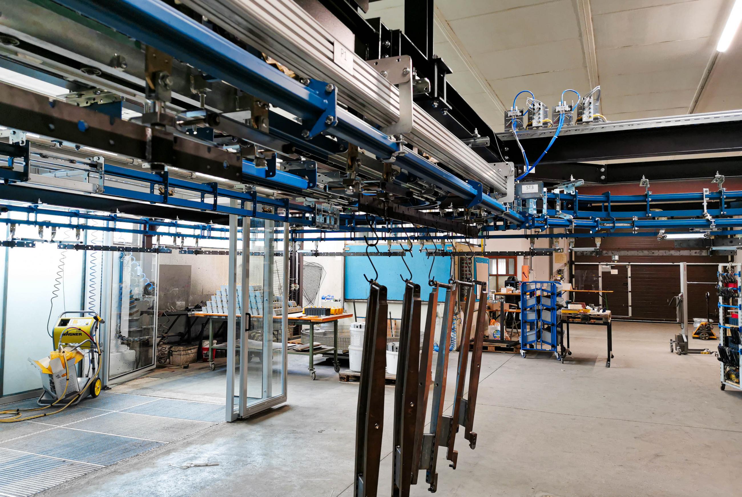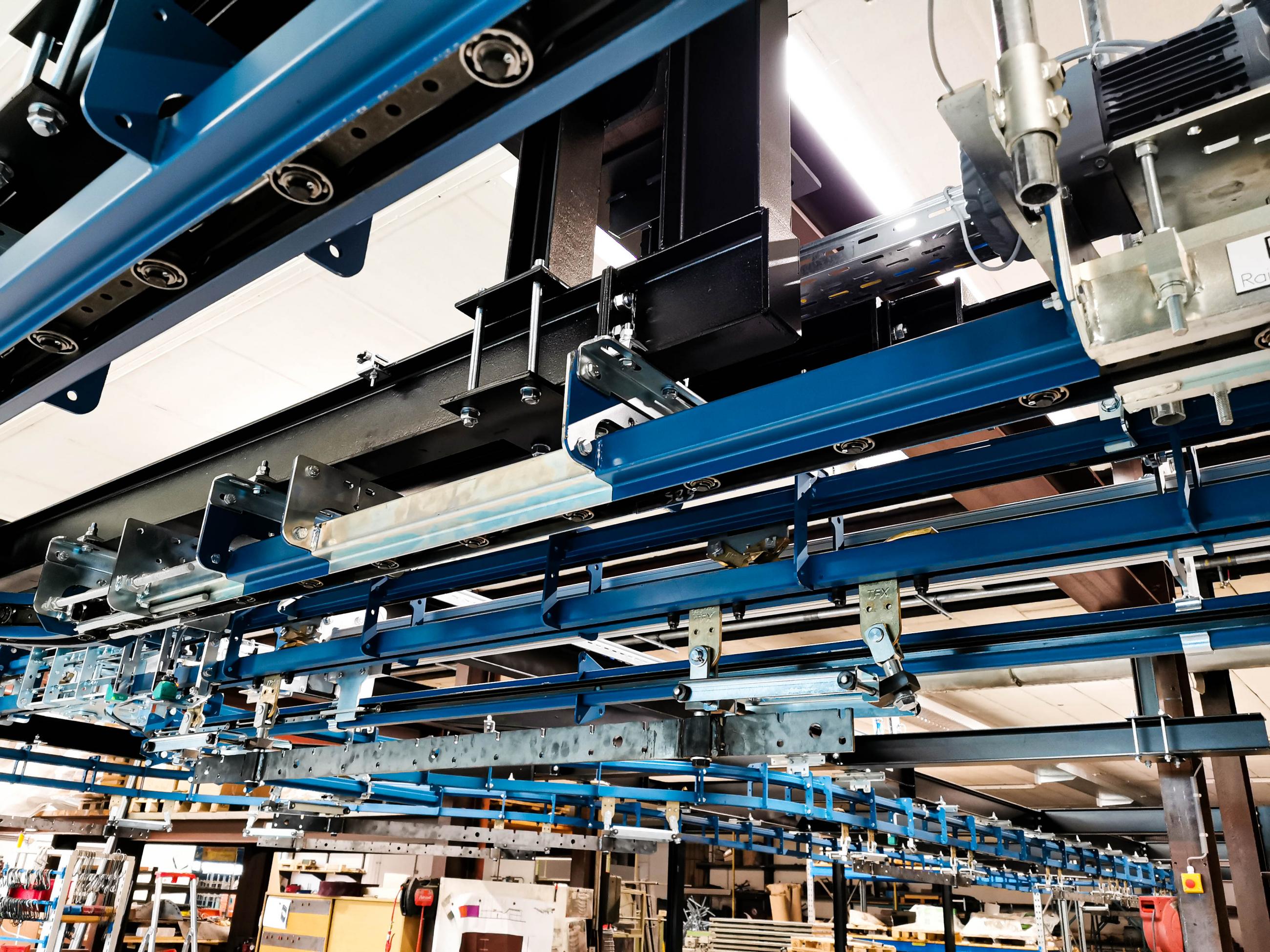 Vor kurzem haben wir einen schönen blauen K8-2 Power & Free Förderanlage mit einem D8 Kettentransfer fertiggestellt. Dieses einfache System befördert Produkte durch eine Pulverbeschichtungskabine und anschließend durch einen Einbrennofen, um abschließend in einem Puffer gelagert zu werden. Das 45 m Hängeförderanlage kann Produkte mit einem Gewicht von bis zu 100 kg pro Wagen befördern - perfekt für die von Fa. Enzi hergestellten Gartenmöbel!
