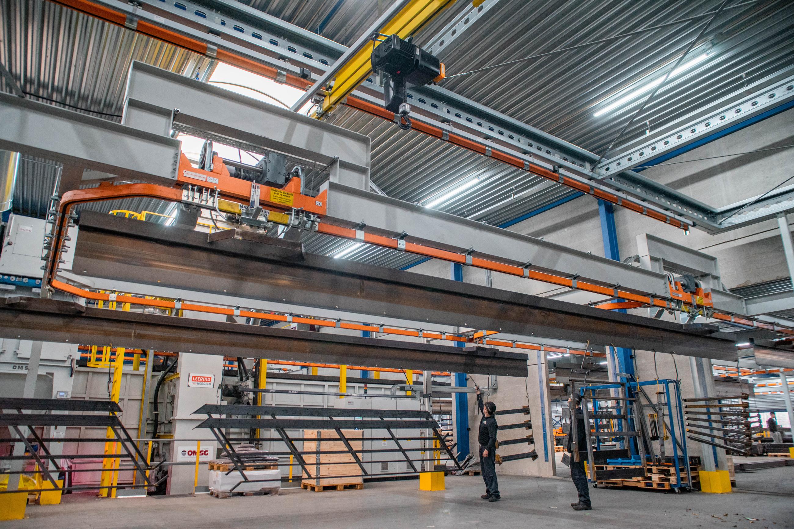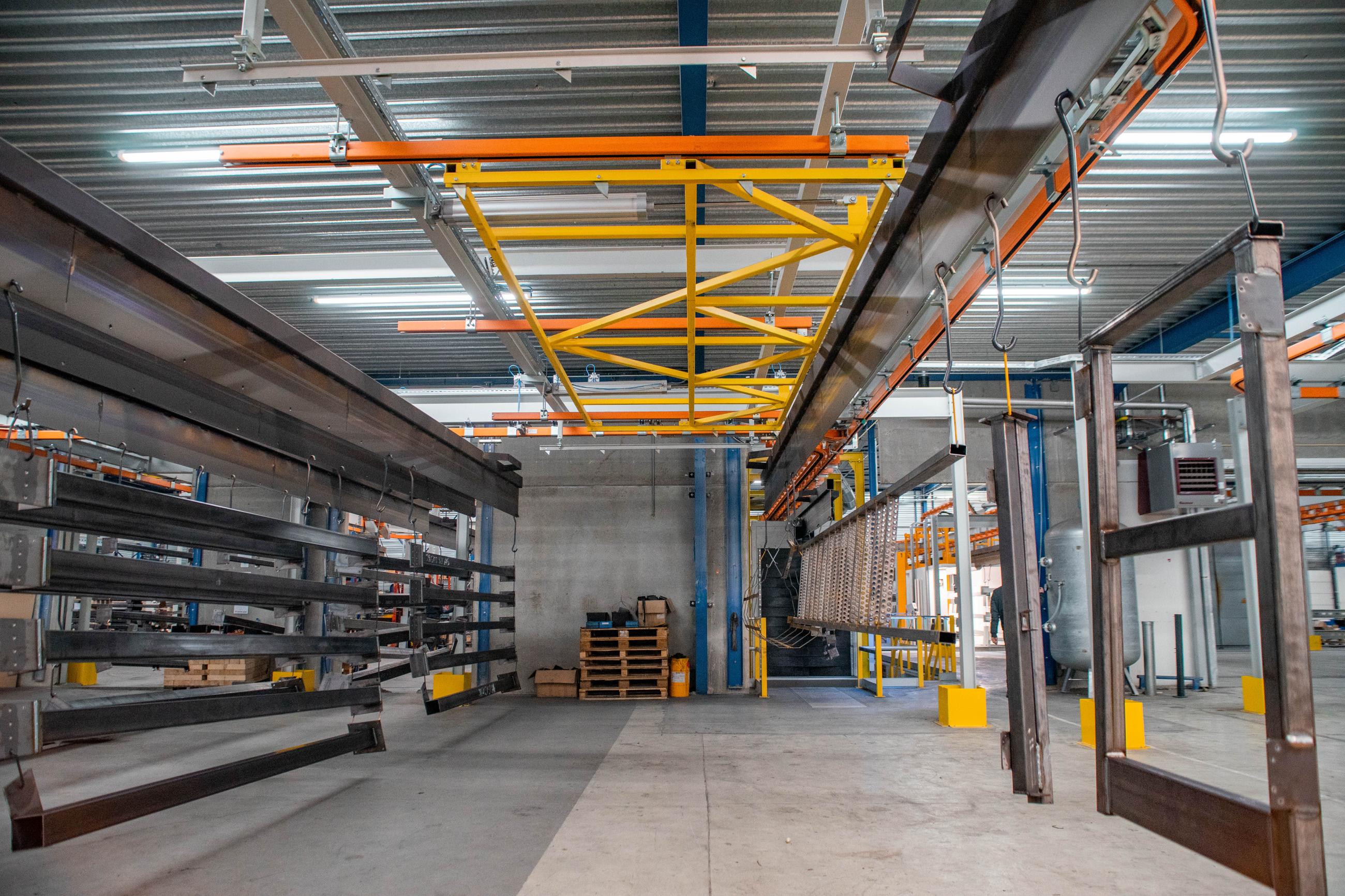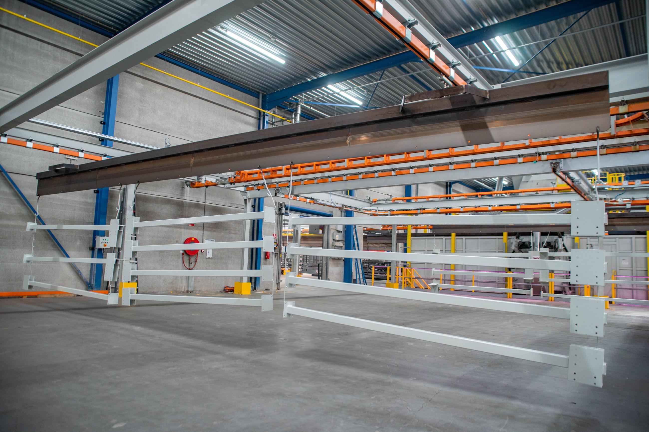 The products run through a sandblasting unit, powder coating line, and there are multiple drop-sections for loading and unloading. Each traverse measures 11m, can handle loads ups to 1250kg and be combined to heat treat products, mainly plate steel profiles, together in the oven cassette system.