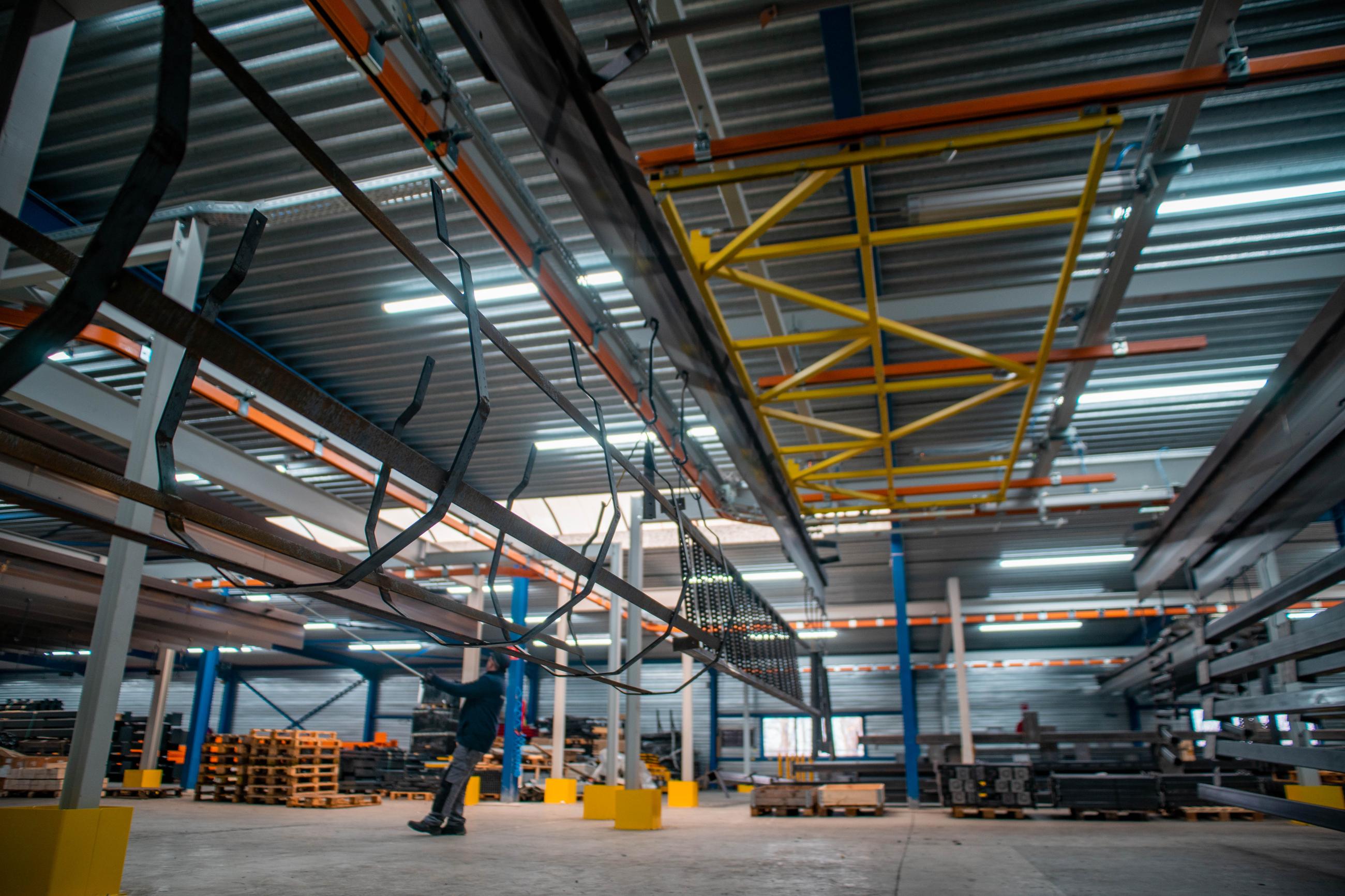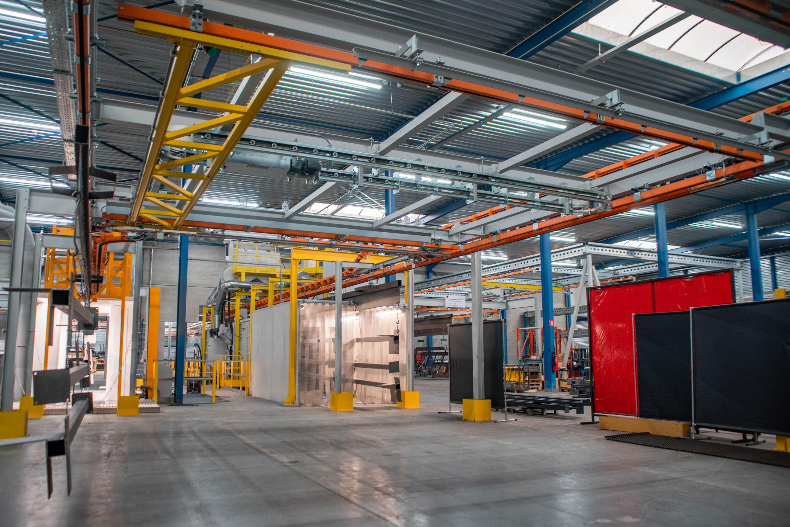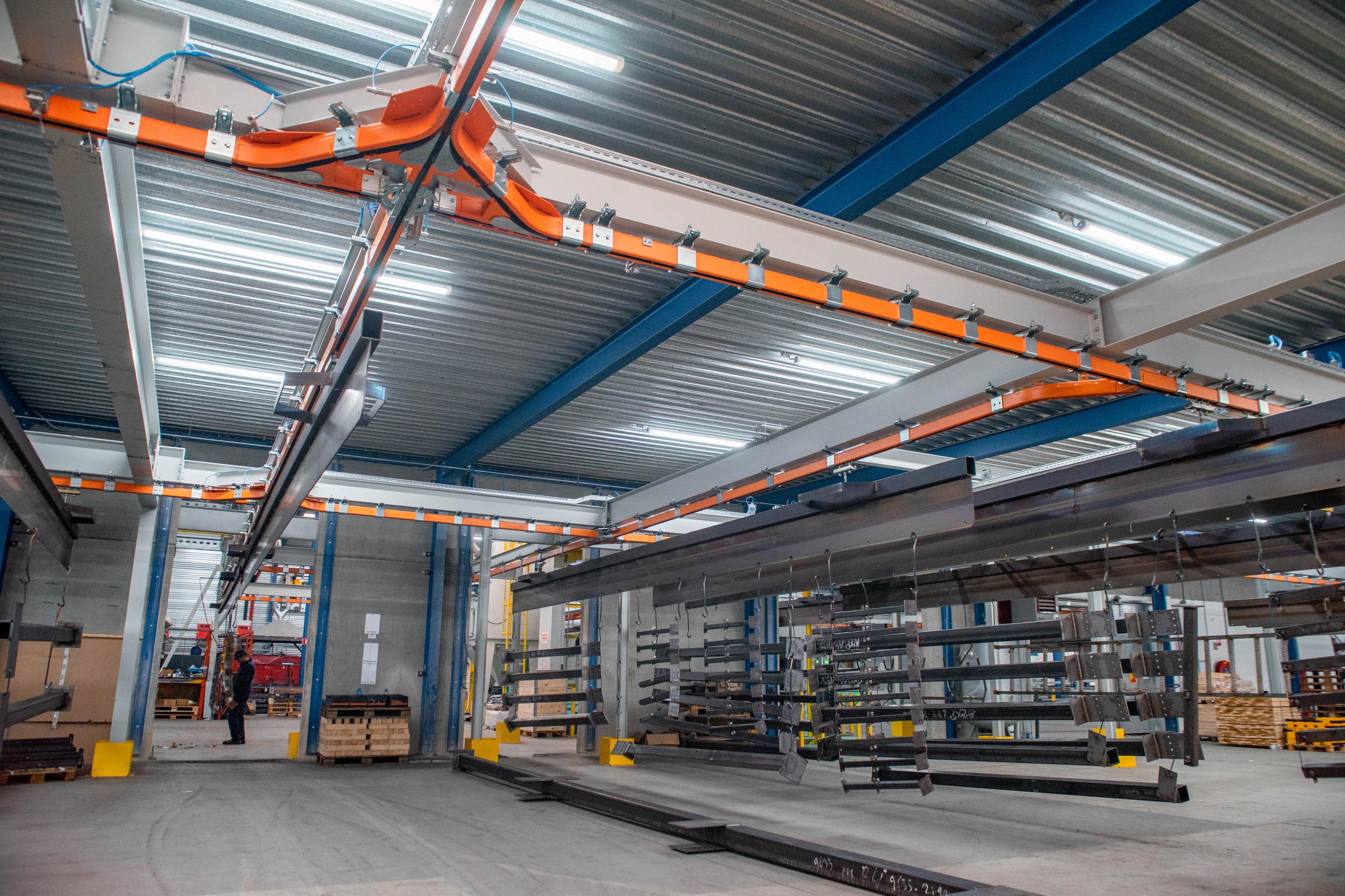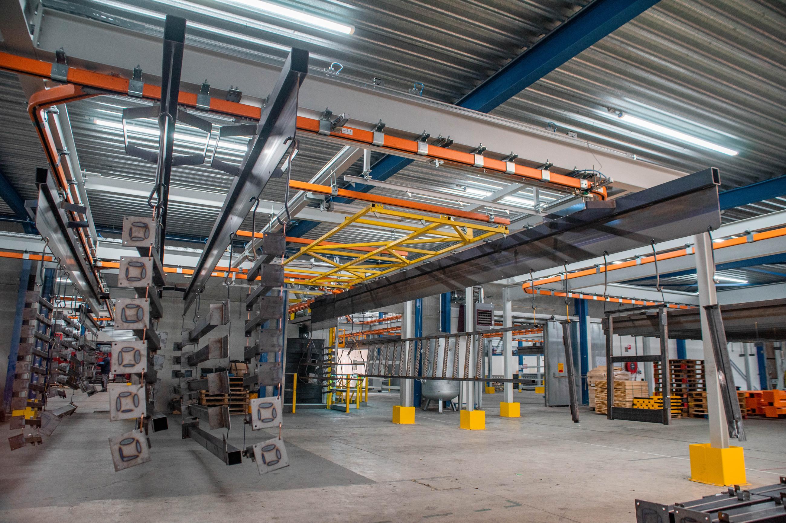The products run through a sandblasting unit, powder coating line, and there are multiple drop-sections for loading and unloading. Each traverse measures 11m, can handle loads ups to 1250kg and be combined to heat treat products, mainly plate steel profiles, together in the oven cassette system.