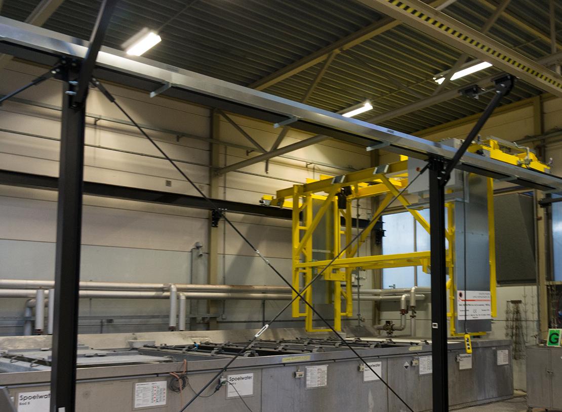 Краны-манипуляторы используются для перемещения изделий в процессе предварительной обработки на основе ванн. Кран может работать автономно или интегрирован с монорельсовым или силовым и свободным подвесным конвейером, при этом грузовые балки, на которых перемещаются изделия, автоматически забираются с конвейера. По окончании процесса предварительной обработки траверсы передаются краном обратно на конвейер для продолжения процесса обработки поверхности.